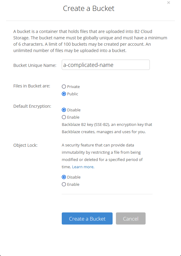 选择 Create a Bucket,在 Bucket Unique Name 一栏填入桶名称,桶名决定了源站的 URL,应尽可能复杂避免被他人猜测到。若源站 URL 泄露,绕过 Cloudflare 的直接访问就会产生额外流量了。其余项如下图保持默认即可: