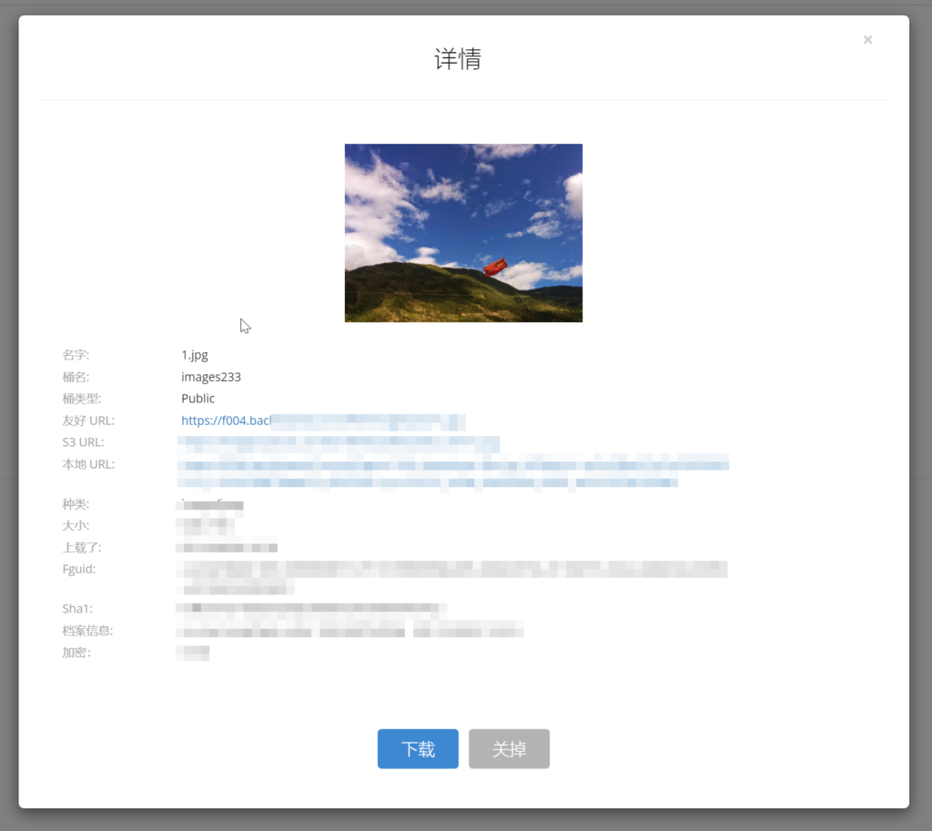 创建完成后,选择 Upload / Download 尝试在桶中上传一张图片,查看图片的详细信息,其中 Friendly URL 一项就是生成的图片链接。