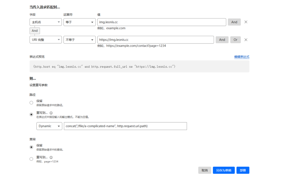 该规则筛选得到所有主机名为 img.leonis.cc 的请求,将其 URL 重写到 concat("/file/a-complicated-name", http.request.uri.path),也就是把所有对 img.leonis.cc/* 的请求指向 img.leonis.cc/file/a-complicated-name/*。而因为 img.leonis.cc 已经通过 CNAME 指向了 f000.backblazeb2.com,最终请求都到达 f000.backblazeb2.com/file/a-complicated-name/* 并取得图片资源。