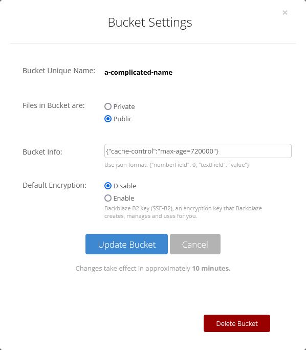 回到 Backblaze 找到 Bucket Settings 一项,在 Bucket Info 中填入 {"cache-control":"max-age=720000"},该项将 Cloudflare 回到源站获取资源的周期设定为 720000 s,用于避免回源次数过多导致加载速度过慢。当然,该周期过长也会导致源文件更改后不能及时更新,可以按自己的需求更改。