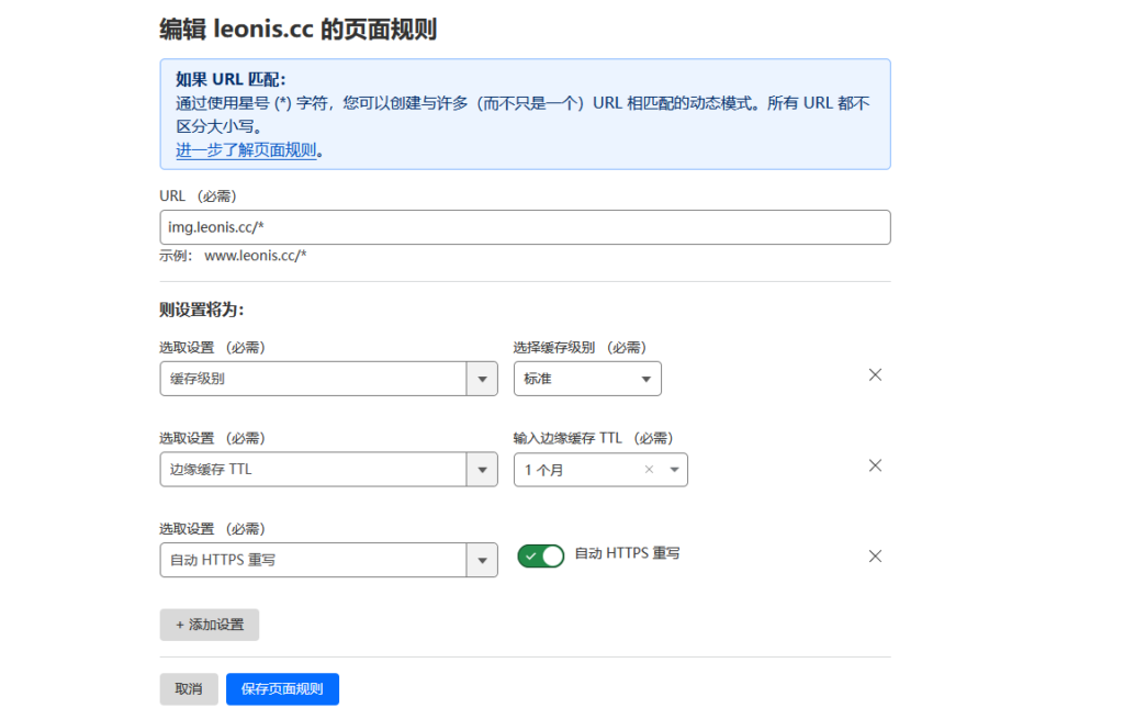 在 Cloudflare 中打开 规则 – 页面规则,新建一条页面规则,在 URL 一栏中填入 img.leonis.cc/*,按下图设置设置缓存和 HTTPS 即可。