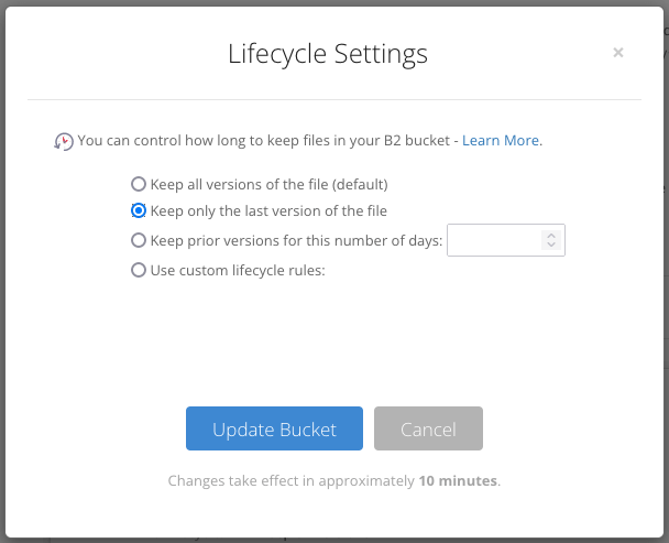 点击 Lifecycle Settings ,选择 Keep only the last version of the file 。点击 Update Bucket 按钮。