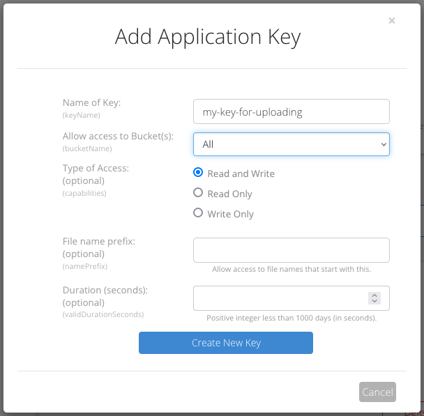 点击页面左侧菜单 Account 项下的 Application Keys ,然后点击 Add a New Application Key ,在 Name of Key 项填写应用程序密钥名称(我填的 my-key-for-uploading),其余保持默认即可。点击 Create New Key 按钮。